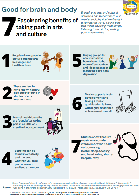 As part of this work, we are sharing communications – materials on the background and value of arts-led provision in healthcare – to colleagues and teams. Read on for a selection of infographics and reports that can help communicate the impact of the arts in health, which you are free to use and share.